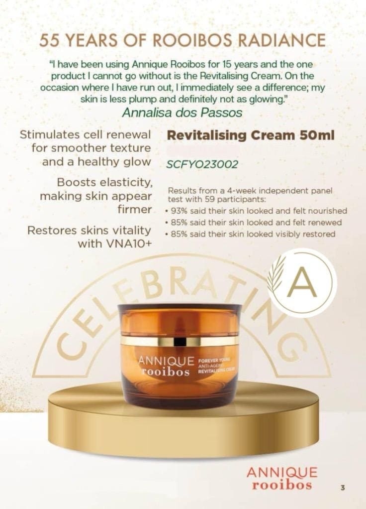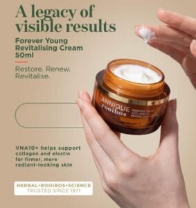 The ideal anti-ageing cream for the restoration, renewal and rejuvenation of skin cells. Forever Young Revitalising Cream is our flagship product and is by far the most popular under Annique users. The Revitalising Cream restores the cells’ ability to retain moisture and stimulates the cells’ own production of collagen and elastin for a faster cell replacement cycle. Rooibos extract adds potent natural antioxidants that have anti-ageing and skin-soothing benefits. VNA 10+ helps to nourish, repair and visibly restore skin. VNA10+ is a highly effective plant extract from the Mexican ‘Skin Tree’ that helps to improve skin elasticity, cell turnover and moisture content, for more plump and youthful-looking skin.